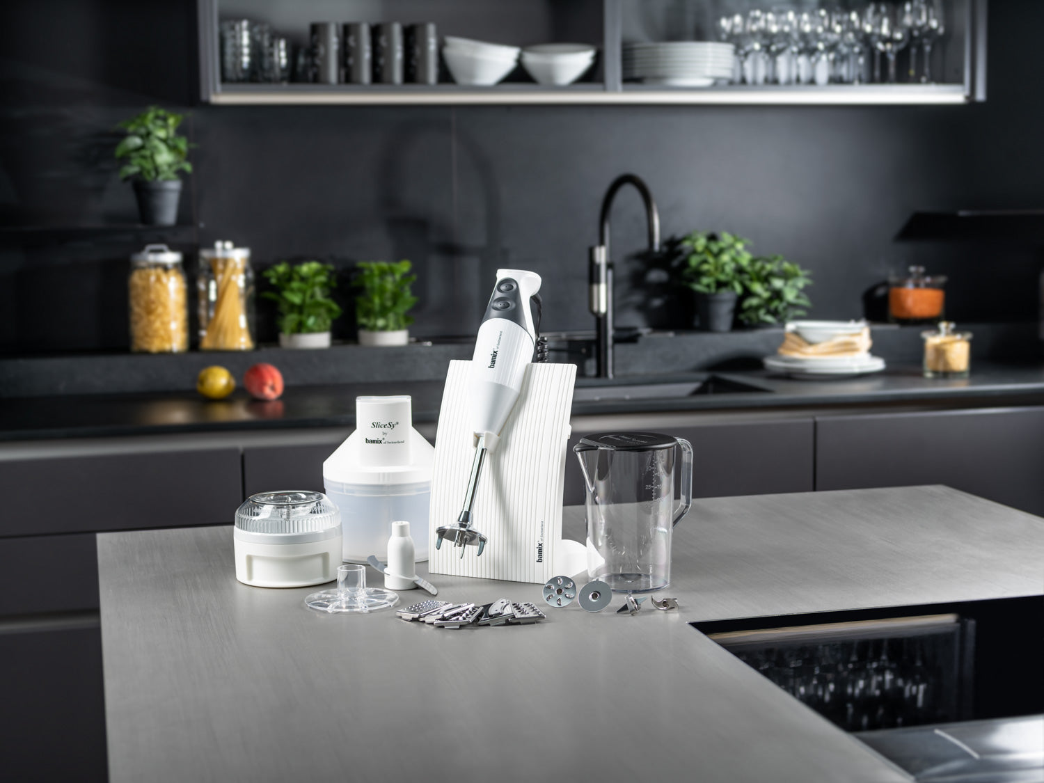 Includes everything you need: Bamix hand blender, all four blades, Processor, Powder Disc, SliceSy, 1000ml Jug, stand – the ultimate kitchen companion in one box.