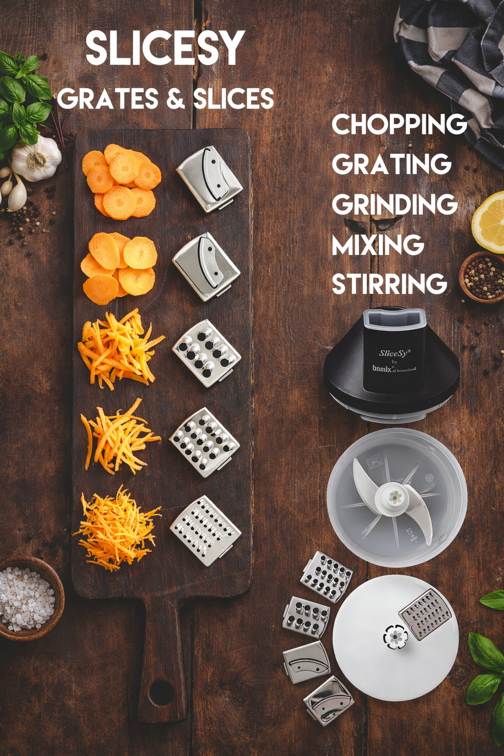 The Bamix Slicesy is designed for quick and easy slicing and grating of vegetables, fruits, cheese, and more. It turns your Bamix hand blender into a compact food processor.