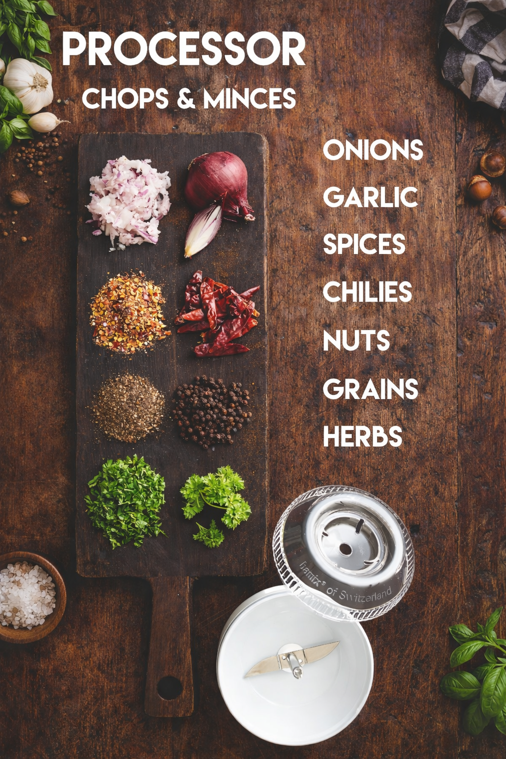 The Bamix Processor is ideal for grinding, chopping, and mixing small quantities of both dry and wet ingredients. It's perfect for herbs, spices, nuts, and even coffee beans.